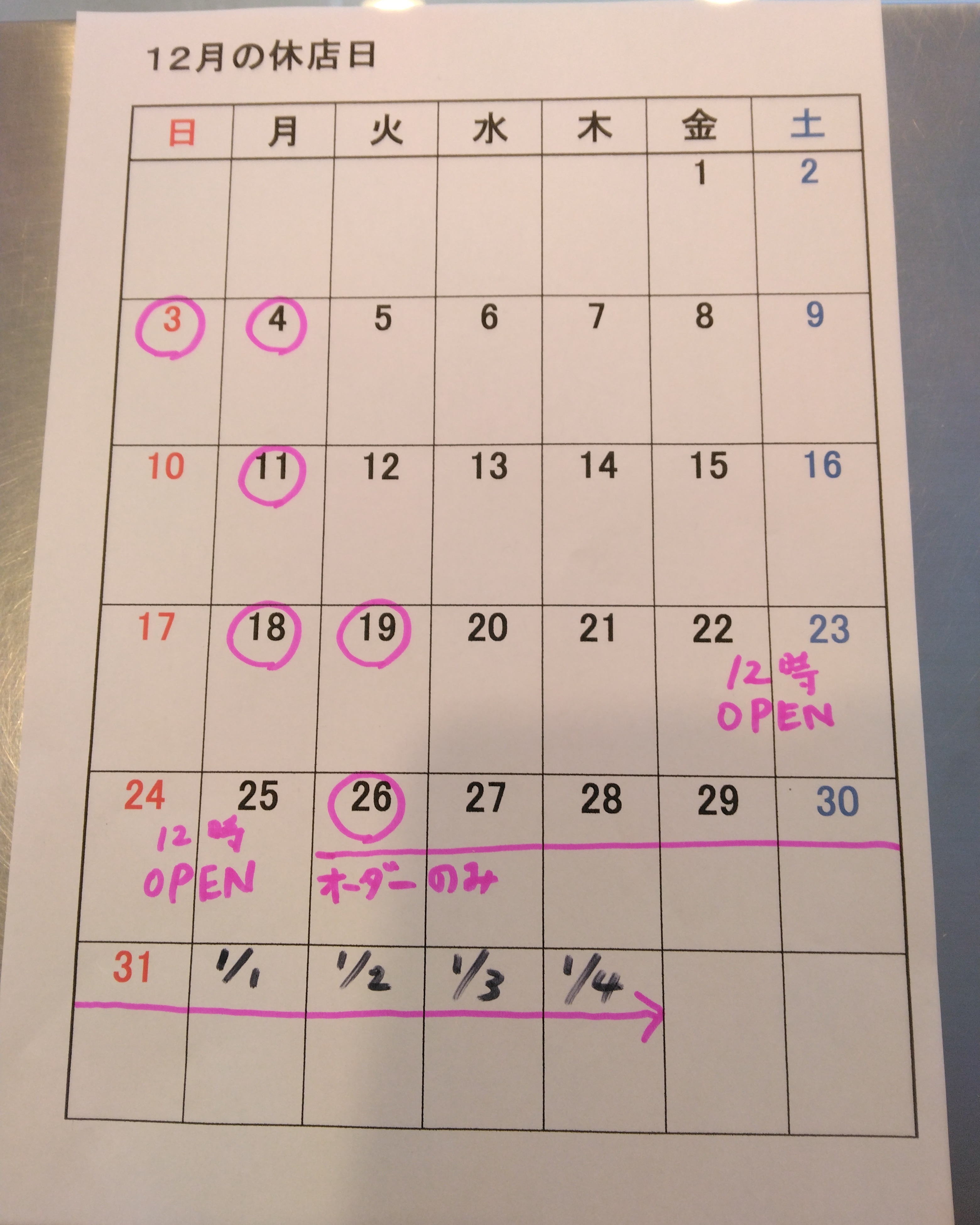 12月のお休み 2023.11.30 up 12月のお休みと営業時間です。 ○は店頭販売休みですがオーダーは可能です 12/22~12/25(クリスマス期間) 12:00に開店いたします オーダーの受け取りも12:00からとなります 12/26~1/4(年末年始) 店頭販売休みですが、オーダーは可能です お受け取り時間はご相談させて頂く場合があります クリスマス、年末年始はご予約集中する場合ごさいます どうぞお早めにご予約、ご相談ください お待ちしております!
