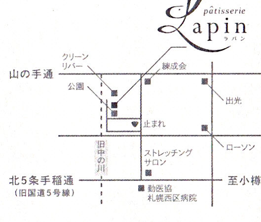 宮の沢駅からの道順:西友前の通りを山に向かって(平和方面)上がっていき、ローソンを左折、まっすぐ進んで右側小道5本目を右折、止まれ標識がありますので左折後突き当たりを右折(正面に川右手に公園)角の白い3階建ての1階